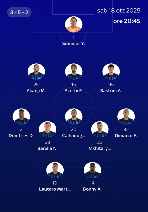 索默;阿坎吉、阿切尔比、巴斯托尼;邓弗里斯、巴雷拉、恰尔汗奥卢、姆希塔良、迪马尔科;劳塔罗、博尼