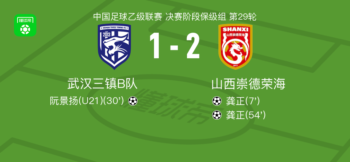 北京时间10月18日,中国足球乙级联赛决赛阶段保级组第29轮展开较量,武汉三镇B队坐镇主场迎战山西崇德荣海。比赛中,山西崇德荣海率先打破僵局,张奥送出助攻,龚正完成破门。此后,武汉三镇B队由阮景扬攻入一球,将比分扳平。易边再战,山西崇德荣海再次取得领先,龚正接应进攻再度建功。最终,全场比分定格为武汉三镇B队1-2山西崇德荣海。