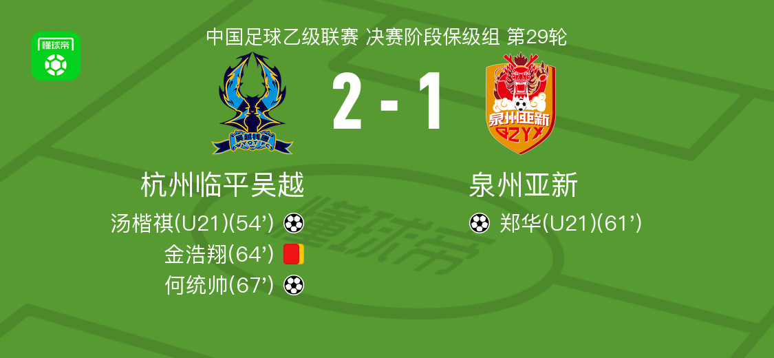 北京时间10月18日中国足球乙级联赛 决赛阶段保级组 第29轮,杭州临平吴越主场对阵泉州亚新。杭州临平吴越汤楷祺破门,何统帅破门。泉州亚新郑华破门。最终比分杭州临平吴越 2–1 泉州亚新。