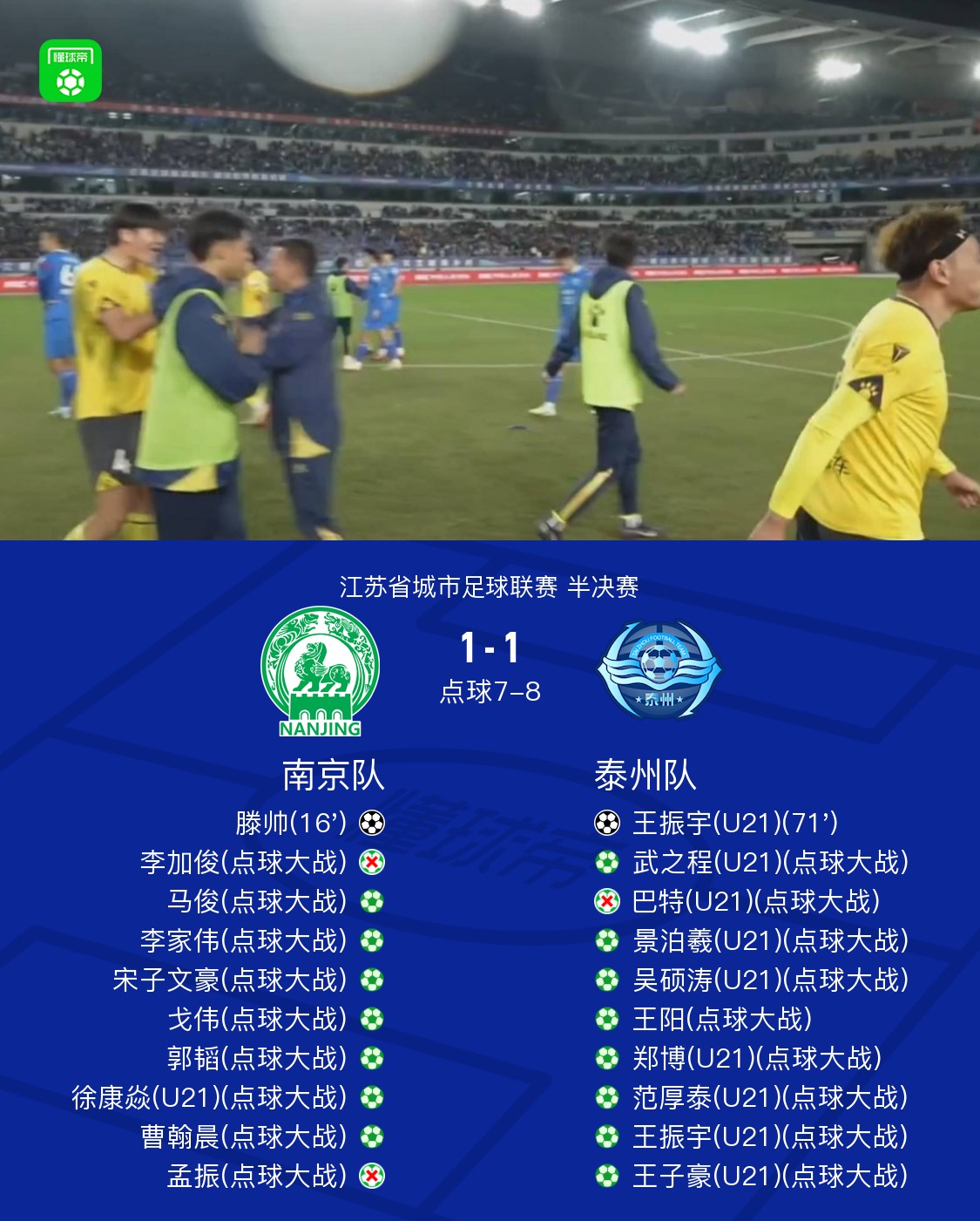 北京时间10月18日江苏省城市足球联赛 半决赛,南京队主场对阵泰州队。南京队滕帅破门。泰州队王振宇破门。最终比分南京队 8–9 泰州队。