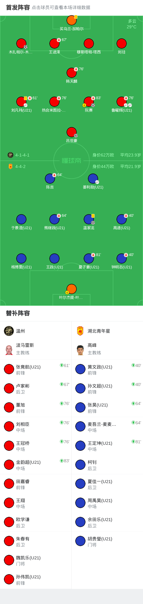 北京时间10月18日中国足球乙级联赛 决赛阶段保级组 第29轮,温州主场对阵湖北青年星。温州阮赛破门,木扎帕尔-木合塔破门,吕世豪破门。湖北青年星温家龙破门。最终比分温州 31 湖北青年星。