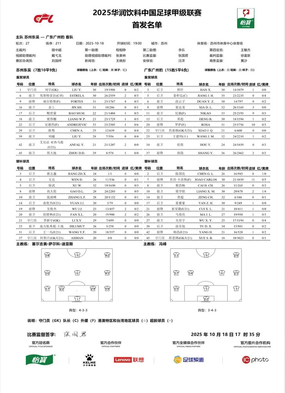 北京时间10月18日19:00,中甲第27轮,苏州东吴主场迎战广东广州豹。赛前,双方首发公布如下: