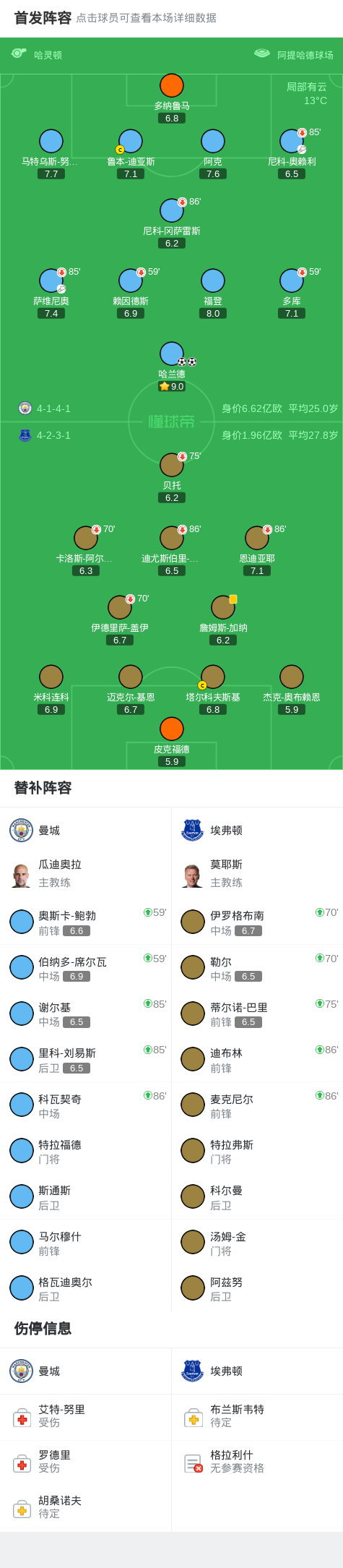 北京时间10月18日英格兰足球顶级联赛 联赛 第8轮,曼城主场对阵埃弗顿。曼城哈兰德梅开二度。最终比分曼城 2–0 埃弗顿。