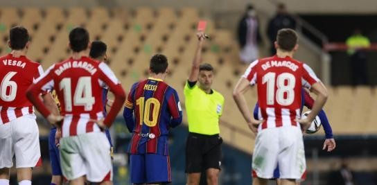在2021年西班牙超级杯决赛中,曼萨诺直接红牌罚下梅西,就此凑齐了对巴萨传奇“MSN”三叉戟的罚下纪录。当时,梅西在与毕尔巴鄂竞技球员比利亚利夫雷的纠缠中手臂有推搡动作,被主裁判直接出示红牌。
