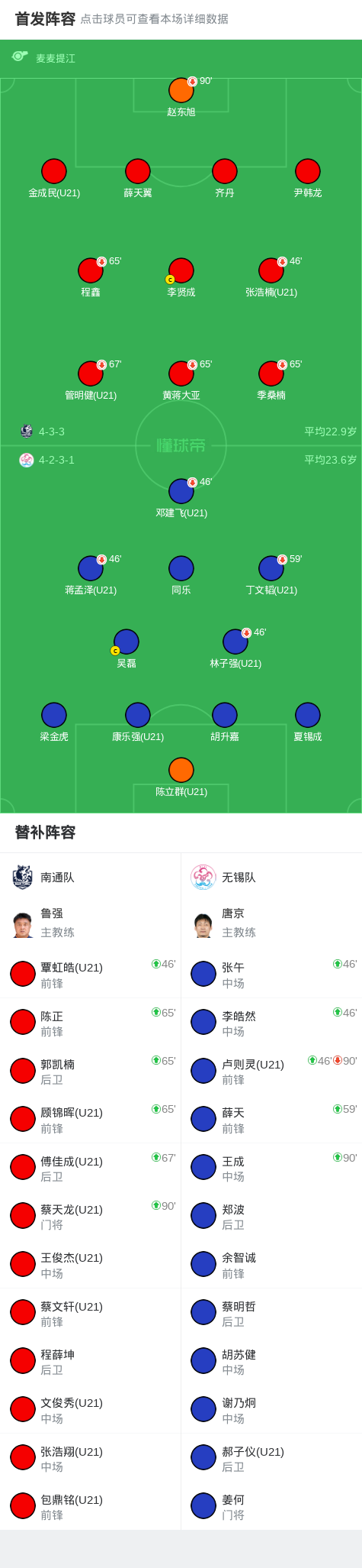 北京时间10月19日江苏省城市足球联赛 半决赛,南通队主场对阵无锡队。最终比分南通队 4–2 无锡队。