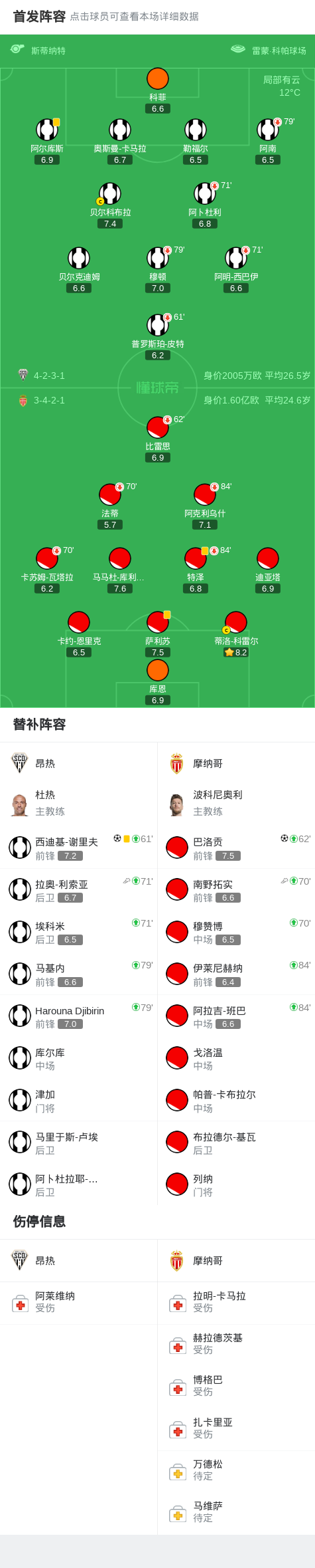 第72分钟,南野拓实助攻,巴洛贡抽射破门,摩纳哥1-0领先