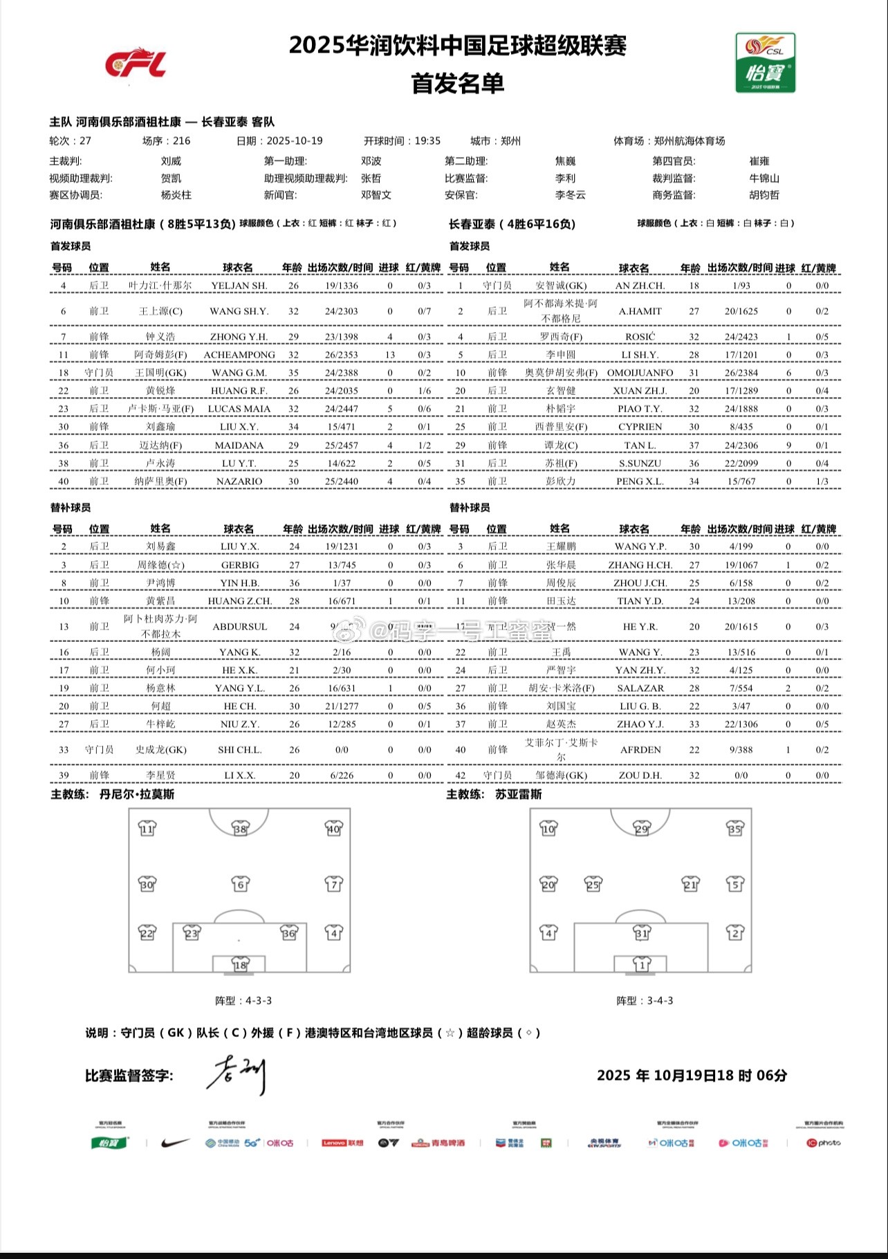 北京时间10月19日19:35,中超联赛第27轮,河南主场迎战长春亚泰,赛前双方公布首发阵容: 文章导航 战鹰:2胜16负对自己是毁灭性打击,心里其实一直有不甘 世体:虽然人手短缺,但贝莱蒂麾下的巴塞罗那竞技状态极佳