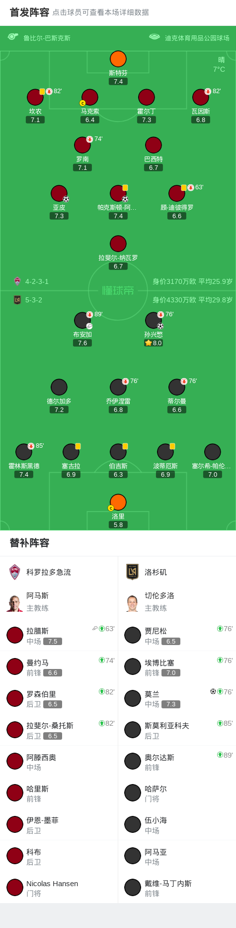 第42分钟,洛杉矶球员布安加助攻孙兴慜打入一球。