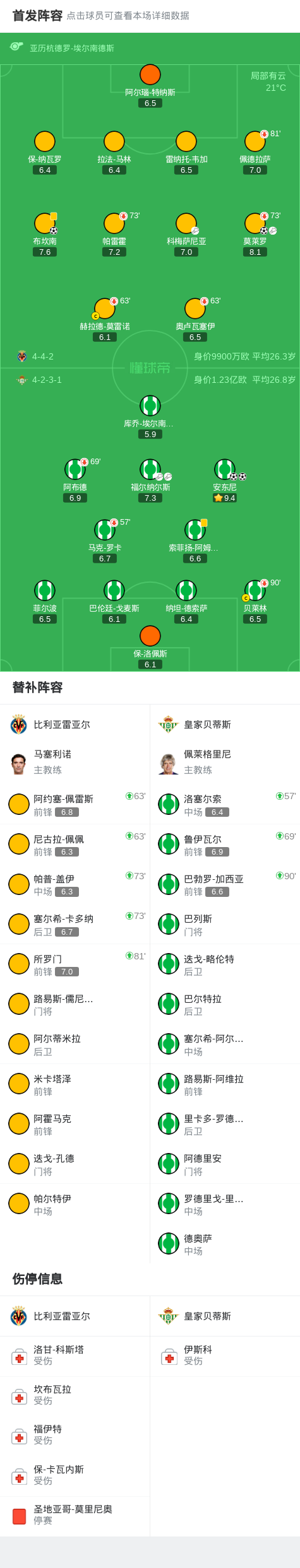 北京时间10月19日西班牙足球甲级联赛 联赛 第9轮,比利亚雷亚尔主场对阵皇家贝蒂斯。比利亚雷亚尔布坎南破门,莫莱罗破门。皇家贝蒂斯安东尼梅开二度。最终比分比利亚雷亚尔 2–2 皇家贝蒂斯。