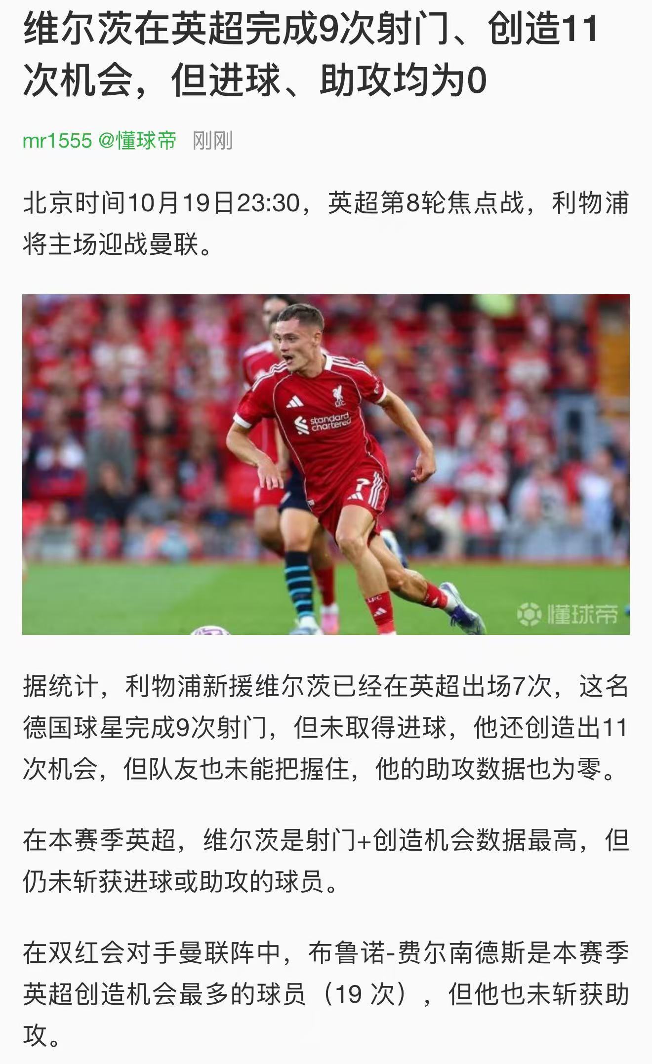 维尔茨在英超完成9次射门、创造11次机会,但进球、助攻均为0
