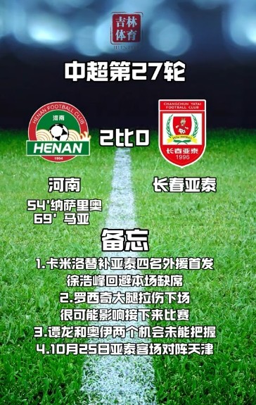 10月19日晚,中超联赛第27轮,排名垫底的长春亚泰客场0-2不敌河南队。来自吉林省体育局官方抖音号的消息——此役长春亚泰外援中卫罗西奇因大腿拉伤下场,很可能影响接下来的比赛。
