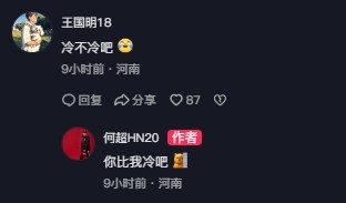 在该动态评论区,河南队门将王国明留言:“冷不冷吧。”随后,何超回复道:“你比我冷吧。”相关新闻阅读:【河南队门将王国明庆祝赢球:恭喜球队喜提3分,差点感冒了】