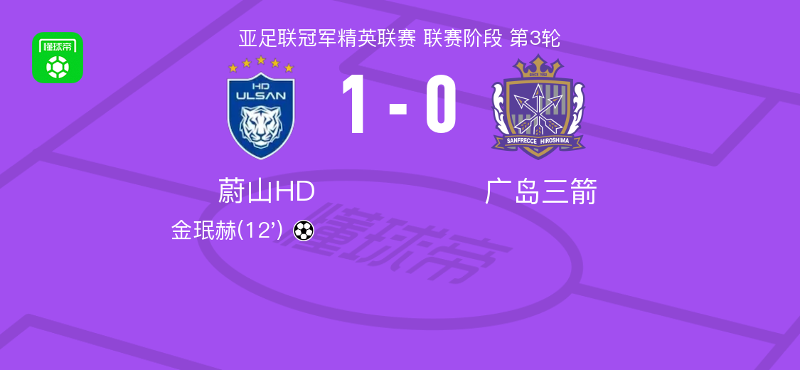 北京时间10月21日,亚足联冠军精英联赛联赛阶段第3轮,蔚山HD与广岛三箭展开对决。比赛中,李镇贤送出助攻,金珉赫完成破门,为球队打入制胜一球。最终,蔚山HD以1比0战胜广岛三箭。