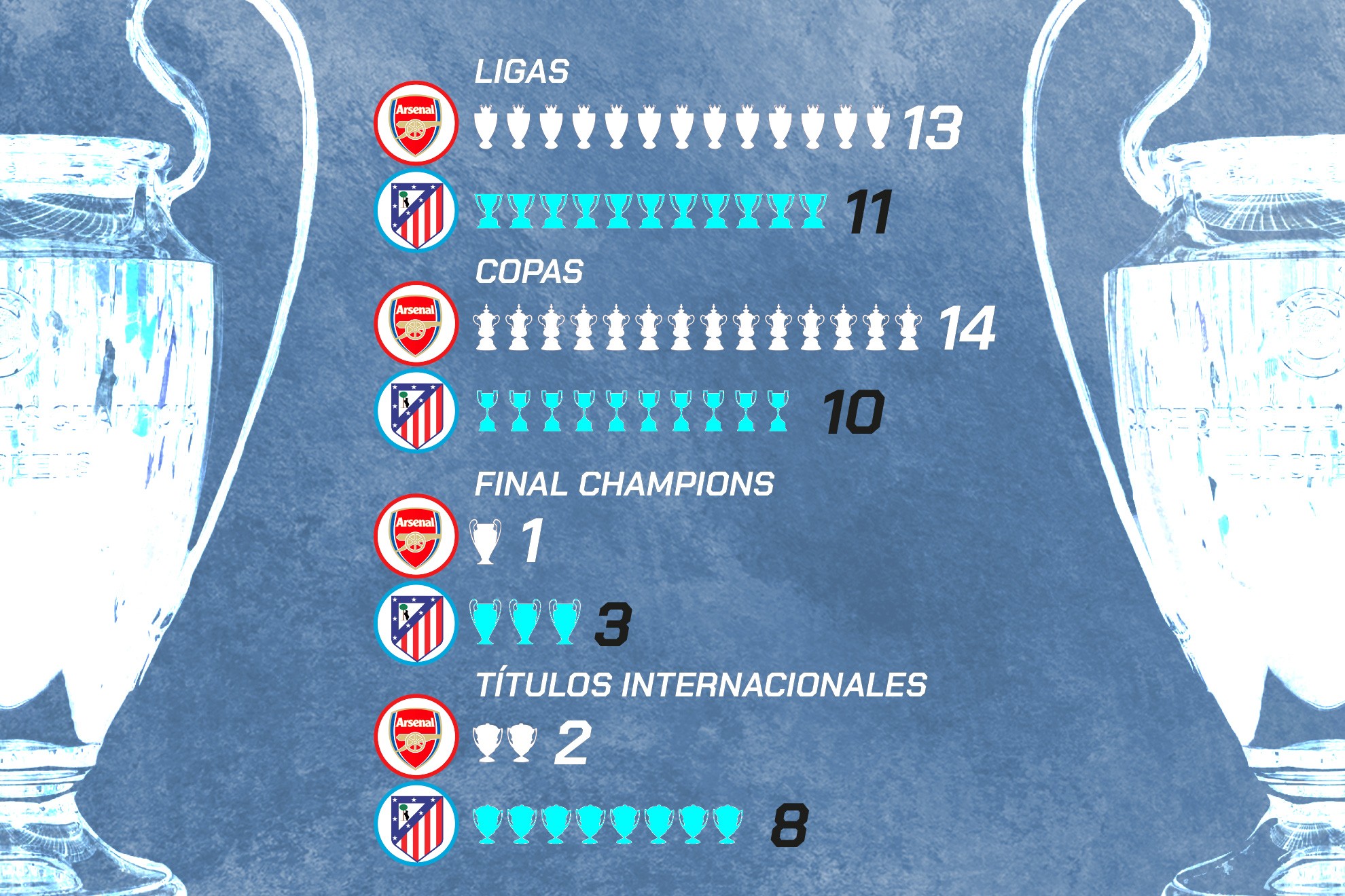 虽然阿森纳在联赛冠军(13次)和足总杯(14次)的数量上领先于马竞(11次联赛、10次杯赛),但如果看国际赛事的荣誉,西班牙球队的优势则明显更大(阿森纳只有2座欧战奖杯,而马竞有8座,包括1975年赢得的洲际杯)。马竞还在欧冠决赛次数上占优(3次对1次)。