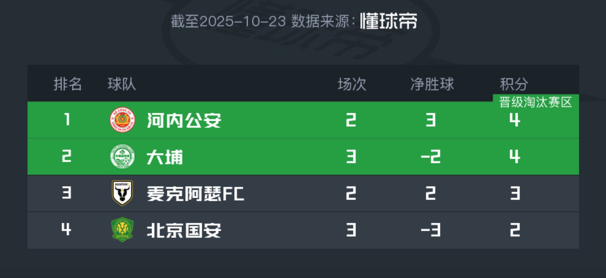 前三轮比赛中,国安客场溃败麦克阿瑟FC,主场战平河内公安,客场战平大埔。目前排名小组第一的河内公安将在稍后与第三位的麦克阿瑟FC进行第三轮小组赛。但无论赛果如何,国安都将落后晋级区2分,暂时垫底。