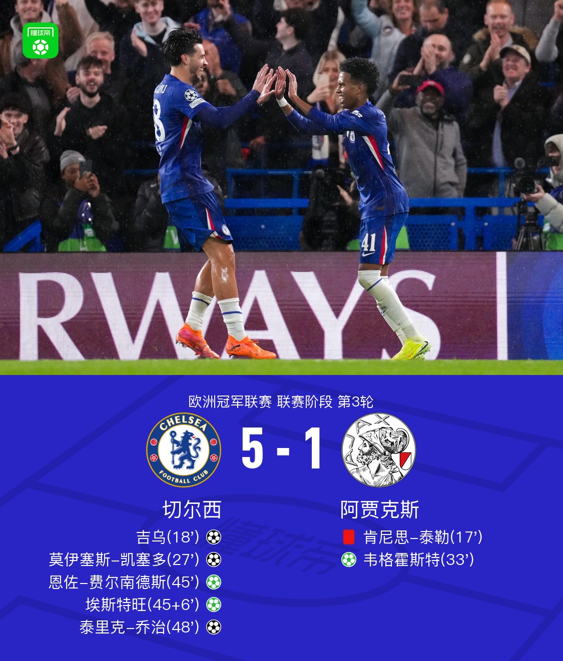 北京时间10月23日欧洲冠军联赛 联赛阶段 第3轮,切尔西对阵阿贾克斯。切尔西吉乌破门,莫伊塞斯-凯塞多破门,泰里克-乔治破门,恩佐-费尔南德斯破门,埃斯特旺破门。阿贾克斯韦格霍斯特破门。最终比分切尔西 51 阿贾克斯。