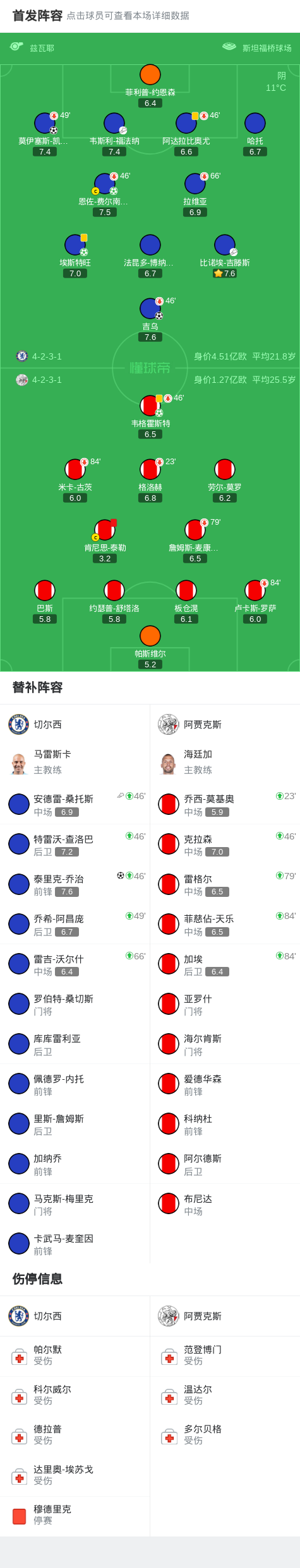 第26分钟,凯塞多远射,皮球击中阿贾克斯后卫折射入网,切尔西2-0