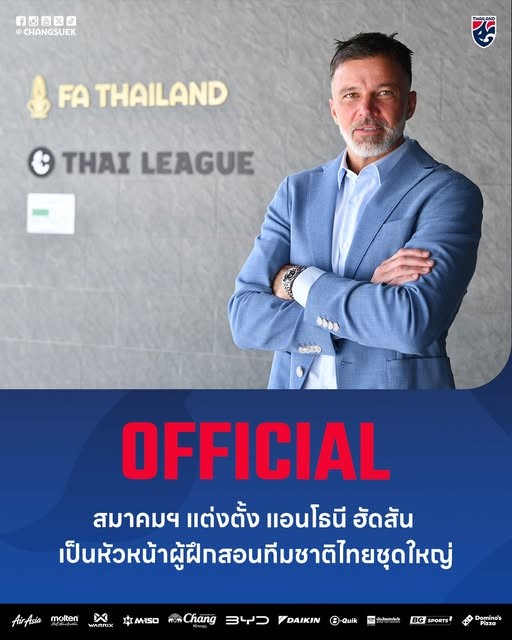 泰国足球协会正式宣布,安东尼-赫德森被任命为泰国国家男子足球队主教练。
