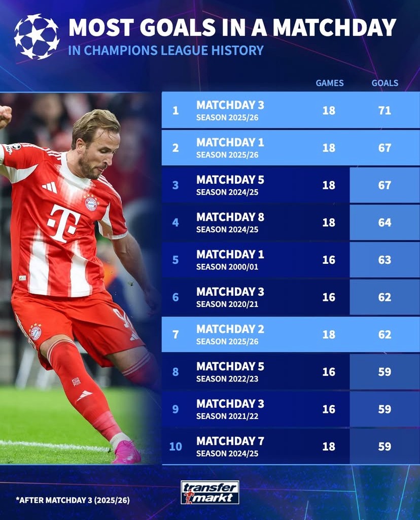 北京时间10月23日,欧冠联赛阶段第3轮的比赛全部结束,18场比赛共计出现了71粒进球,创造欧冠单轮比赛历史纪录,德转也就此统计出了欧冠历史单轮进球数的前10名。