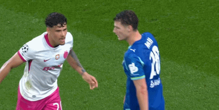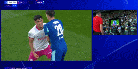 第90+2分钟,阿劳霍推倒纳迪尔吃到红牌,VAR回看后改判黄牌