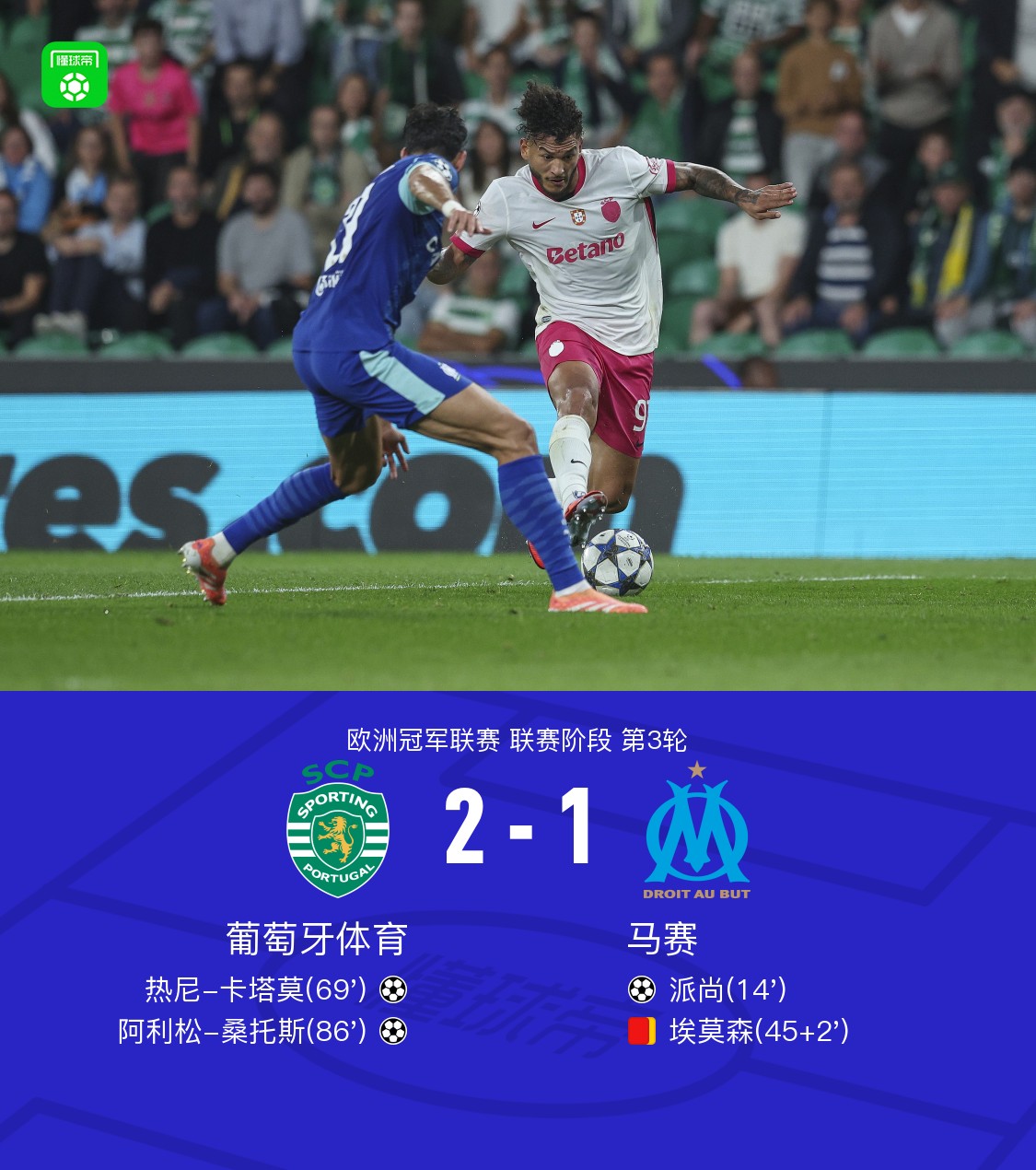 北京时间10月23日欧洲冠军联赛 联赛阶段 第3轮,葡萄牙体育对阵马赛。葡萄牙体育热尼-卡塔莫破门,阿利松-桑托斯破门。马赛派尚破门。最终比分葡萄牙体育 21 马赛。