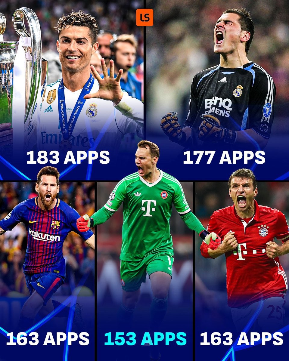 欧冠联赛阶段第三轮,拜仁慕尼黑主场对阵布鲁日,诺伊尔首发出战,迎来欧冠生涯第153次出场,这使得他超越本泽马,独占欧冠历史出场榜第五位。
