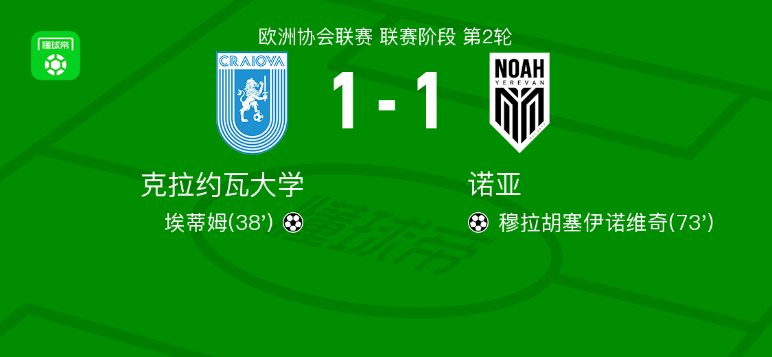 北京时间10月24日,欧洲协会联赛联赛阶段第2轮展开较量,克拉约瓦大学迎战诺亚。比赛中,梅克瓦比什维利送出精准助攻,埃蒂姆冷静施射破门,为球队取得领先。随后,苏阿莱赫以一次巧妙传球找到穆拉胡塞伊诺维奇,后者抓住机会扳平比分。最终双方1比1握手言和。