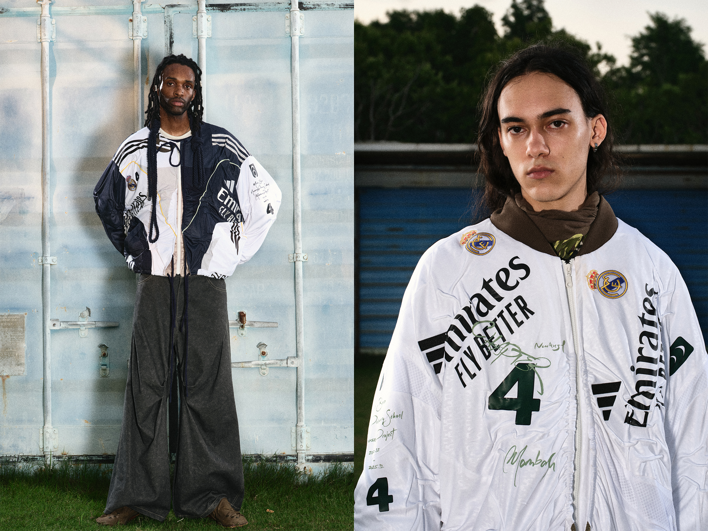 这组作品基于皇家马德里球衣的再创作,但设计语言却拒绝了赛场上的单向叙事,以飞行员夹克、不对称裙子与拼接球衣等方式,让皇家马德里这一全球性的“渴望”,与地方性的根脉进行了一场亲密的对话。东非传统面料Kanga的图腾结构,被解构后重新嵌入,纽结形态与手工缝线与那些斯瓦希里语的手写文字并置,成为具象的记忆载体。每一件飞行员夹克的内衬,都印着当地孩子亲笔写下梦想的信件,服装成为他们故事的部分延续。