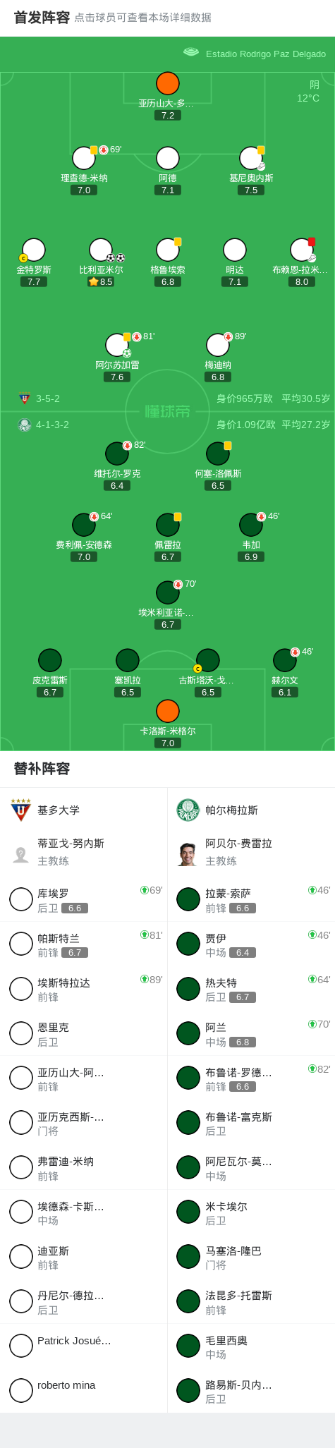 北京时间10月24日南美解放者杯 半决赛首回合,基多大学对阵帕尔梅拉斯。基多大学比利亚米尔梅开二度,阿尔苏加雷破门。最终比分基多大学 3–0 帕尔梅拉斯。