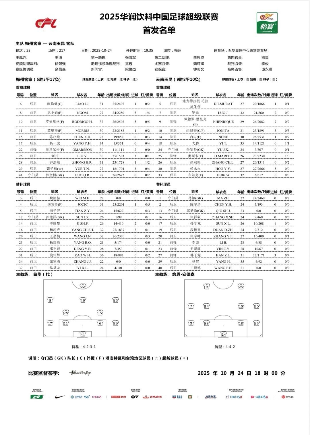 北京时间10月24日19:35,中超第28轮的一场较量。梅州客家坐镇主场,迎战云南玉昆。赛前,双方的阵容公布如下: 文章导航 记者:皇马希望恩德里克留在西甲,球员想去参加欧战的俱乐部 英媒:谢周三拖欠100万英镑税款,面临行政托管以及扣除12分