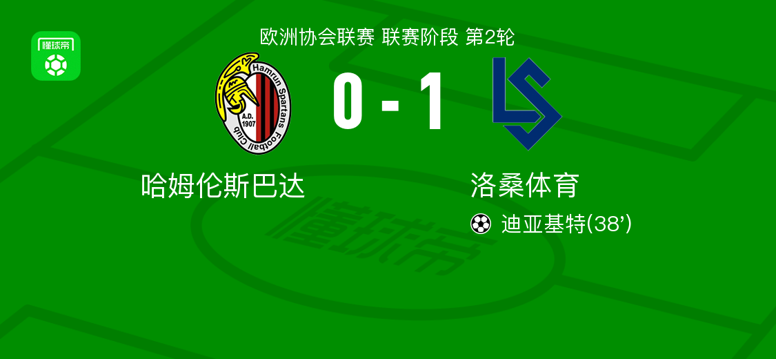 北京时间10月24日欧洲协会联赛 联赛阶段 第2轮,哈姆伦斯巴达对阵洛桑体育。洛桑体育迪亚基特破门。最终比分哈姆伦斯巴达 0–1 洛桑体育。