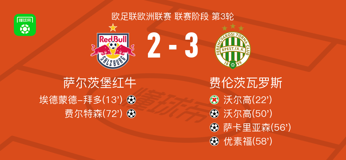 北京时间10月24日欧足联欧洲联赛 联赛阶段 第3轮,萨尔茨堡红牛对阵费伦茨瓦罗斯。萨尔茨堡红牛埃德蒙德-拜多破门,费尔特森破门。费伦茨瓦罗斯沃尔高破门,萨卡里亚森破门,优素福破门。最终比分萨尔茨堡红牛 2–3 费伦茨瓦罗斯。