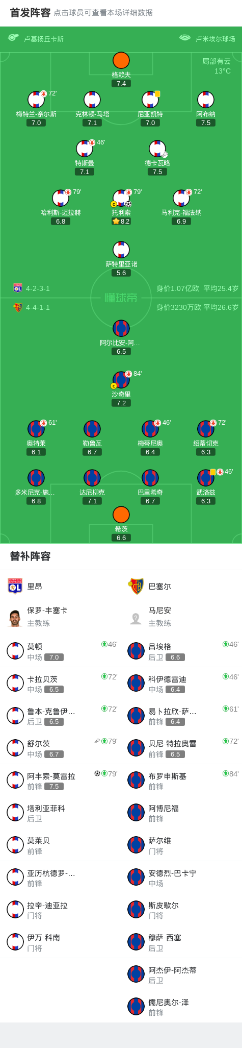 第3分钟,巴塞尔后防连线失误,托利索禁区兜射破门,里昂1-0