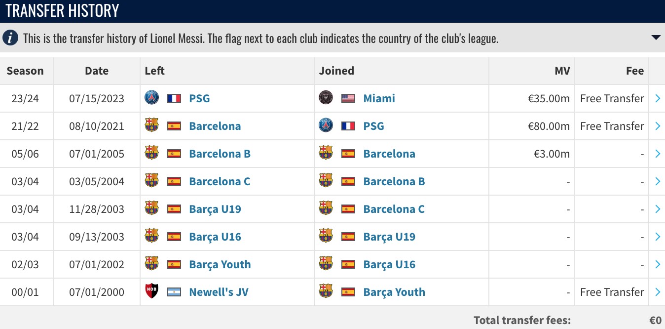 截至目前,梅西分别为巴萨、巴黎圣日耳曼以及迈阿密国际效力过。但所有的转会都是以免签的形式达成的,也就是说梅西职业生涯目前产生的转会费仍是0。