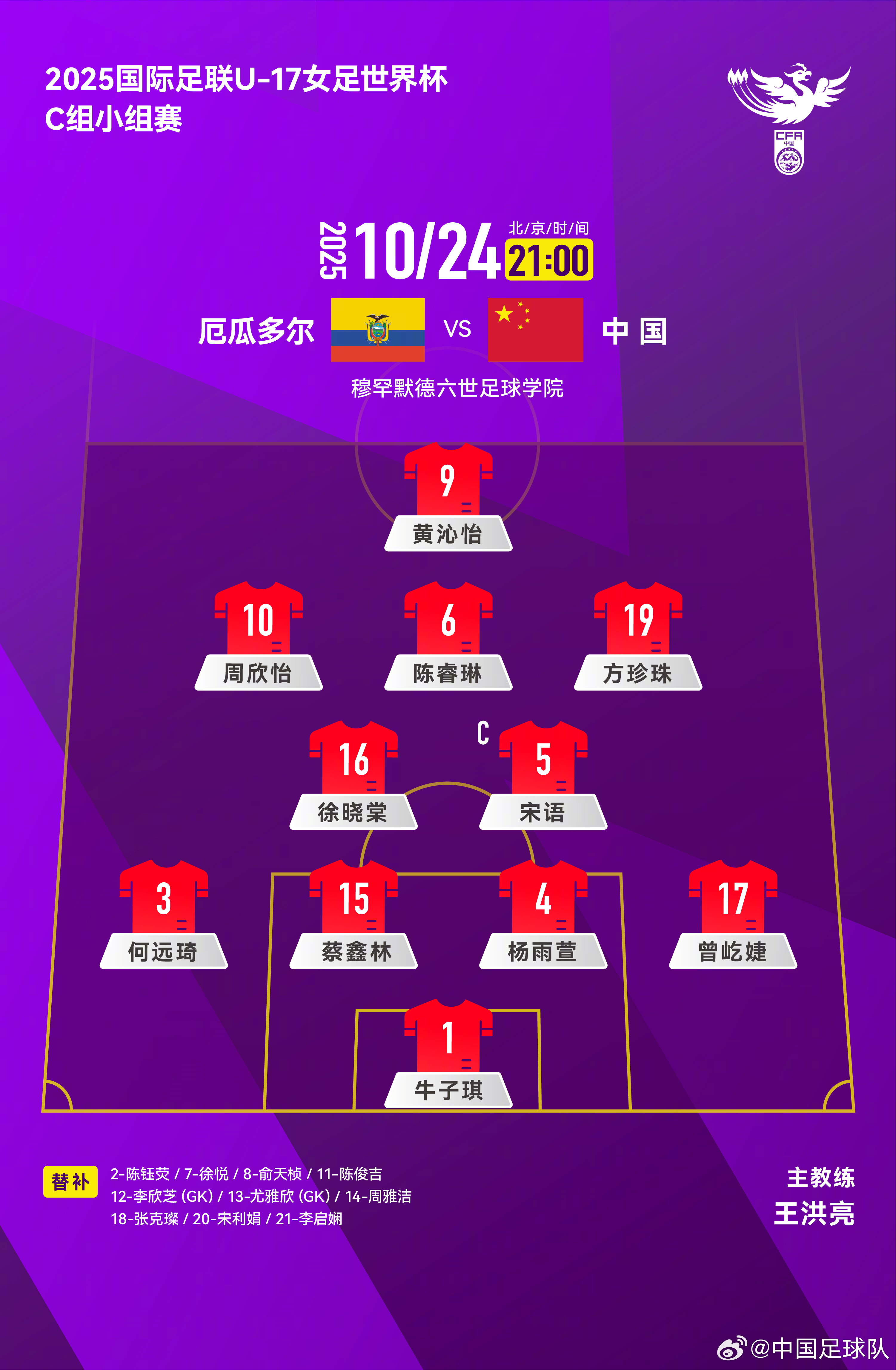 北京时间10月24日21:00,U17女足世界杯小组赛第3轮,U17中国女足对阵厄瓜多尔女足U17。赛前U17中国女足首发公布。