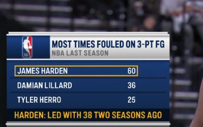 在比赛期间,美国转播方给出了一组数据:在上赛季造成三分犯规的排行榜中,哈登以60次排名榜首,遥遥领先于第二名利拉德的36次,排在第三的是热火后卫泰勒-希罗。同时,哈登也在两个赛季前以38次造成三分犯规领跑该榜单。