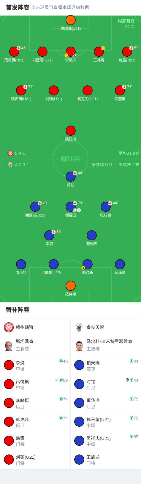 北京时间10月25日中国足球乙级联赛 决赛阶段保级组 第30轮,赣州瑞狮主场对阵泰安天贶。赣州瑞狮李波洋破门。泰安天贶谭福成破门,时铭破门。最终比分赣州瑞狮 1–2 泰安天贶。