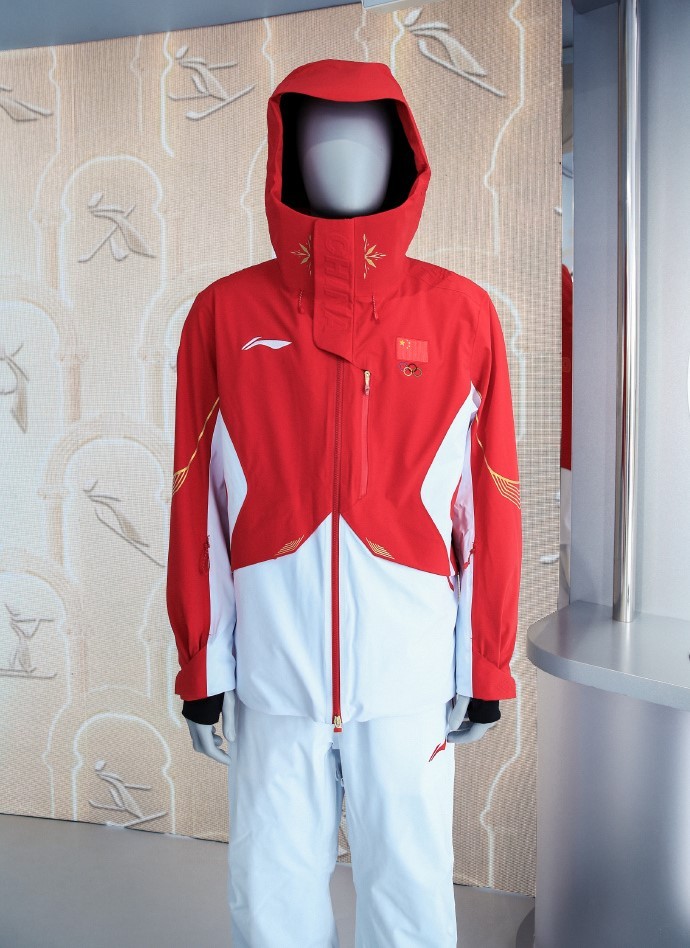 领奖服以红、白两色为主色调, “中国红”充分彰显中国文化元素,在正面勾勒出象征着五角星的线条;“雪山白”灵感源自冬季运动场景,也融入了东方审美里的留白意境,并在侧身搭配以雪道为原型的金色流线型线条为点缀,全身以上红下白的色彩拼接,凸显中国运动健儿的挺拔身姿。