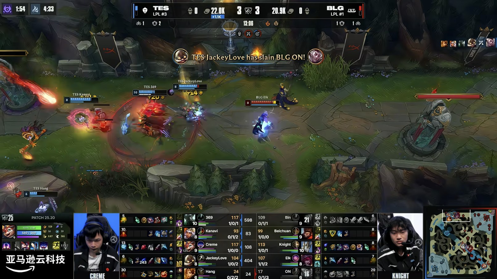 第4分钟,两队换线时369成功断掉BLG双人组回城,TES通过换线收获经验领先+塔皮;