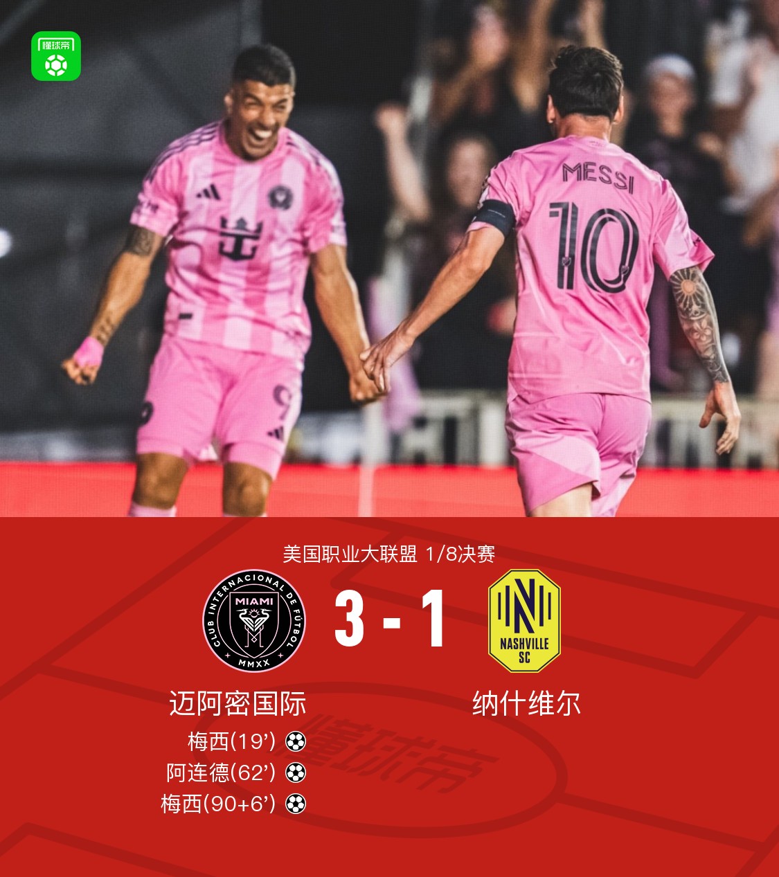 北京时间10月25日,美国职业大联盟季后赛1/8决赛展开争夺,比赛采取三局两胜制。上半场,苏亚雷斯助攻梅西头球破门,率先打破场上平衡。下半场,伊恩-弗雷底线传中,阿连德头球破门将比分扩大。梅西主罚角球直接转向球门后点,皮球击中立柱弹出。阿尔巴传中被扑出,梅西补射破门完成双响。最终,迈阿密国际3-0战胜纳什维尔取得八分之一决赛的首场胜利。