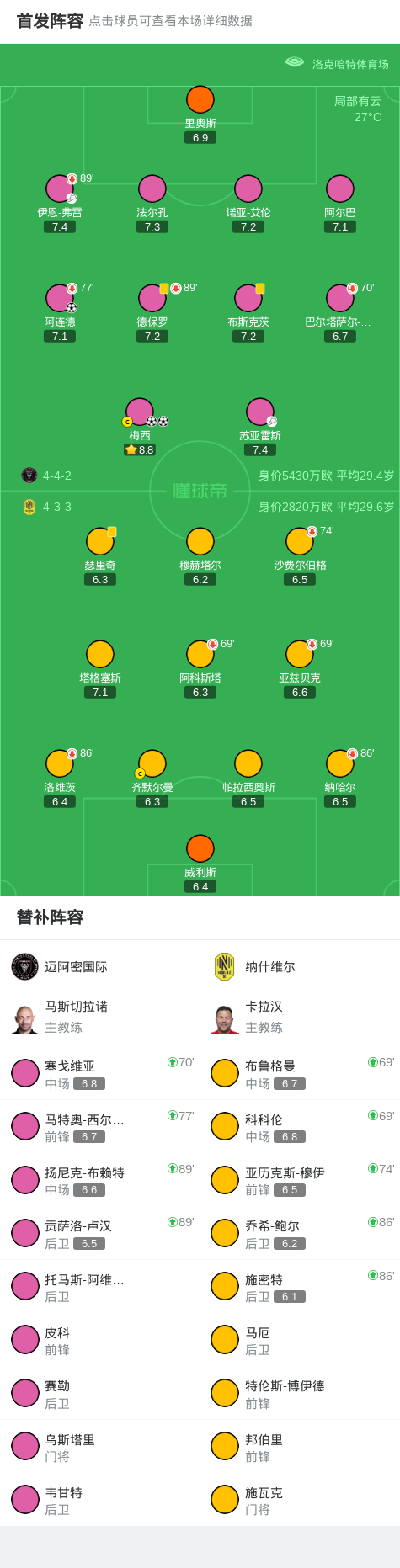第62分钟,伊恩-弗雷传中,阿连德头球破门扩大比分,迈阿密2-0纳什维尔