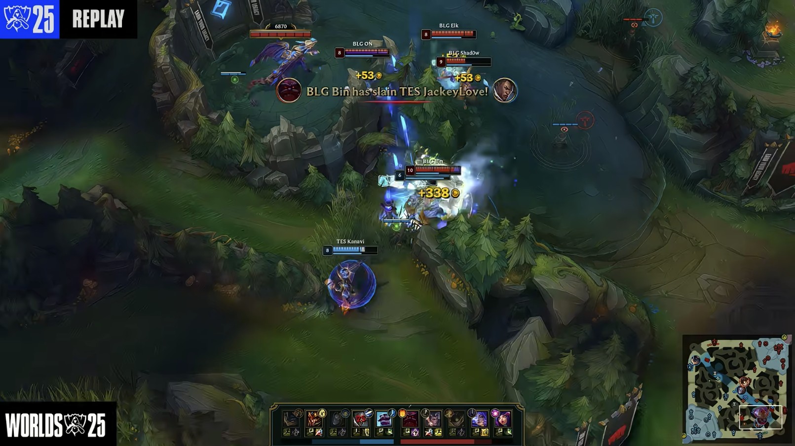第6分钟,双方换线后,Kanavi再去上路找到BLG下路双人组,击杀ON后BLG双人组已经完全爆线,同时BLG尝试抓369的单人线也没能成功;