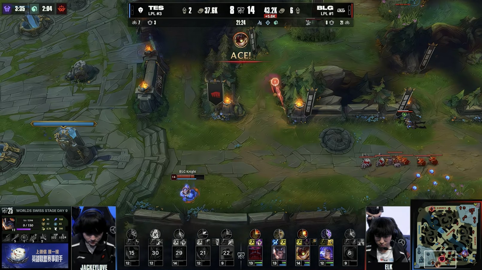 第10分钟,又是BLG双人路被勾引后双双阵亡,随后TES野辅来到中路又抓死Knight;