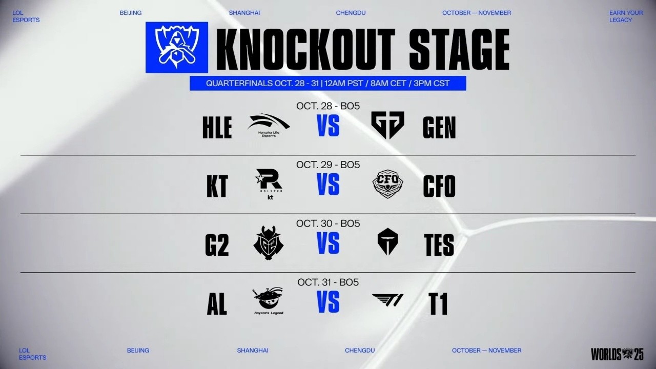 北京时间10月25日,S15世界赛结束瑞士轮全部比赛的争夺,八强抽签已经完成。官方随后公布了八强战的赛程安排,LCK内战HLE对Gen.G将会率先进行,AL和T1的遭遇战则安排在八强最后一天。