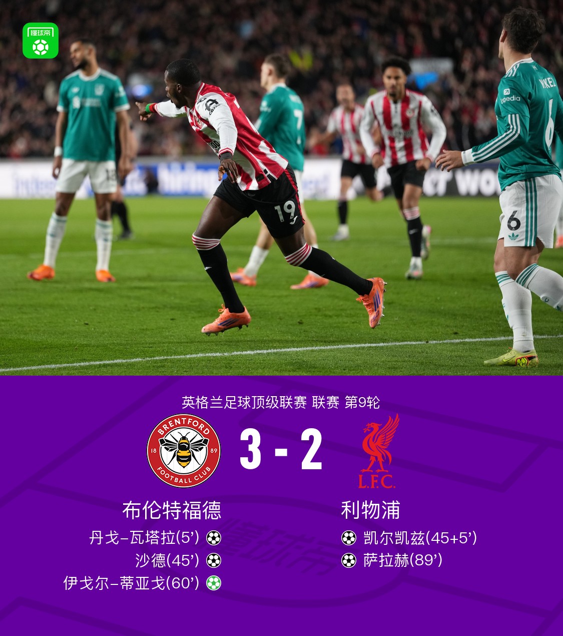 北京时间10月26日,英格兰足球超级联赛第9轮展开较量,布伦特福德坐镇主场迎战利物浦。比赛伊始,丹戈-瓦塔拉率先破门,为布伦特福德取得领先。随后,达姆斯高送出助攻,沙德建功,进一步扩大比分优势。上半场补时阶段,凯尔凯兹为利物浦扳回一城。进入下半场,伊戈尔-蒂亚戈主罚点球命中,帮助布伦特福德再度拉开分差。比赛尾声,索博斯洛伊助攻萨拉赫破门,利物浦奋力追近比分。最终,全场比赛结束,布伦特福德以3-2战胜利物浦。