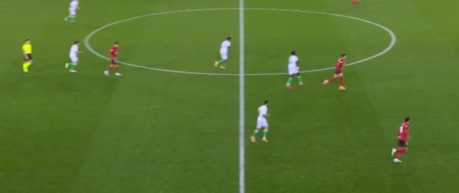 第45分钟,德凯特拉雷禁区头球攻门,门将没收皮球