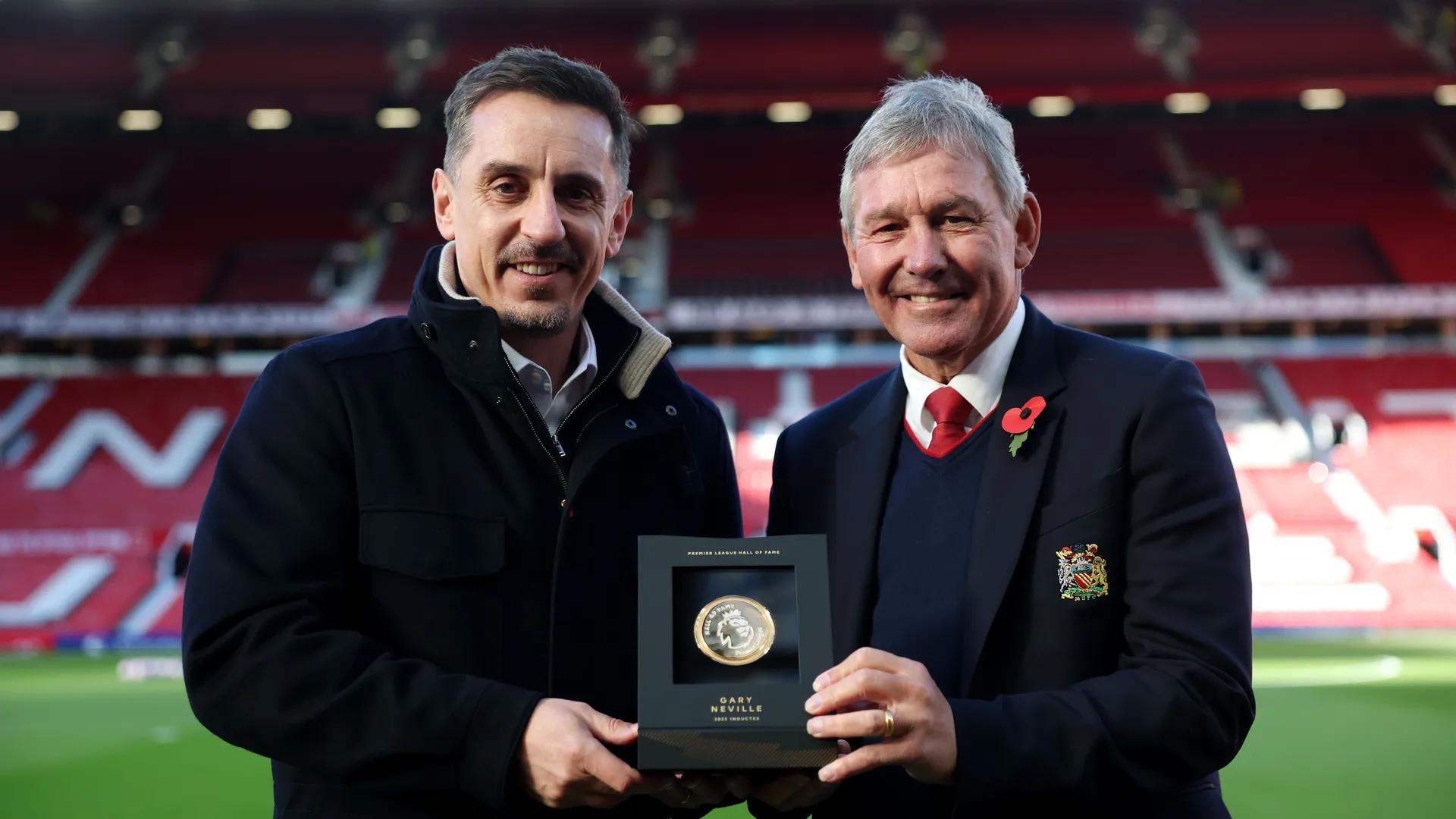 加里-内维尔从前曼联队长布赖恩-罗布森手中接过名人堂奖章。