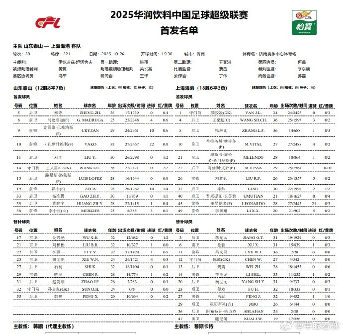 北京时间10月26日15:30,中超联赛第28轮,山东泰山坐镇主场迎战上海海港,本场比赛主裁判是乌兹别克斯坦裁判坦塔舍夫,VAR是黄翼,赛前双方公布首发: 文章导航 蓝十字2-0蒙特雷,奥罗斯科建功,塞普尔韦达锦上添花 辽宁铁人vs南通支云:三外援PK双外援,安以恩、陈彬彬首发