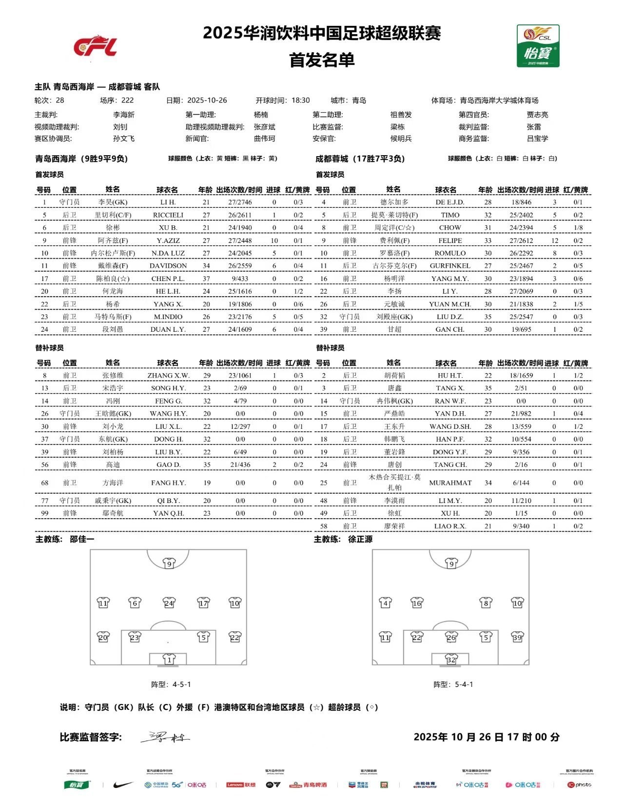 北京时间10月26日18:30,中超第28轮继续进行,成都蓉城作客青岛西海岸大学城体育场挑战青岛西海岸,本场主裁判为李海新,VAR裁判为刘钊,赛前双方首发出炉。 文章导航 曼城联赛客战维拉两连败,上次遭遇更长连败追溯到1975年 巴萨近4次国家德比全胜,有望第二次取得五连胜