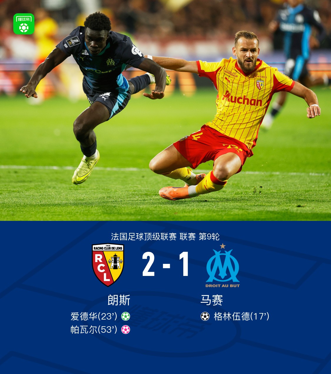 第53分钟,角球开出,乱战中帕瓦尔不慎乌龙,朗斯2-1马赛